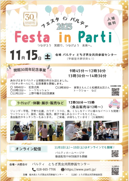 今年のフェスタinパルティは、11月15日(土)に開催! 午前中はホールで開館30周年記念事業を開催します。団体のワークショップや展示・販売等は12時30分から開始します。(食品販売は12時から)